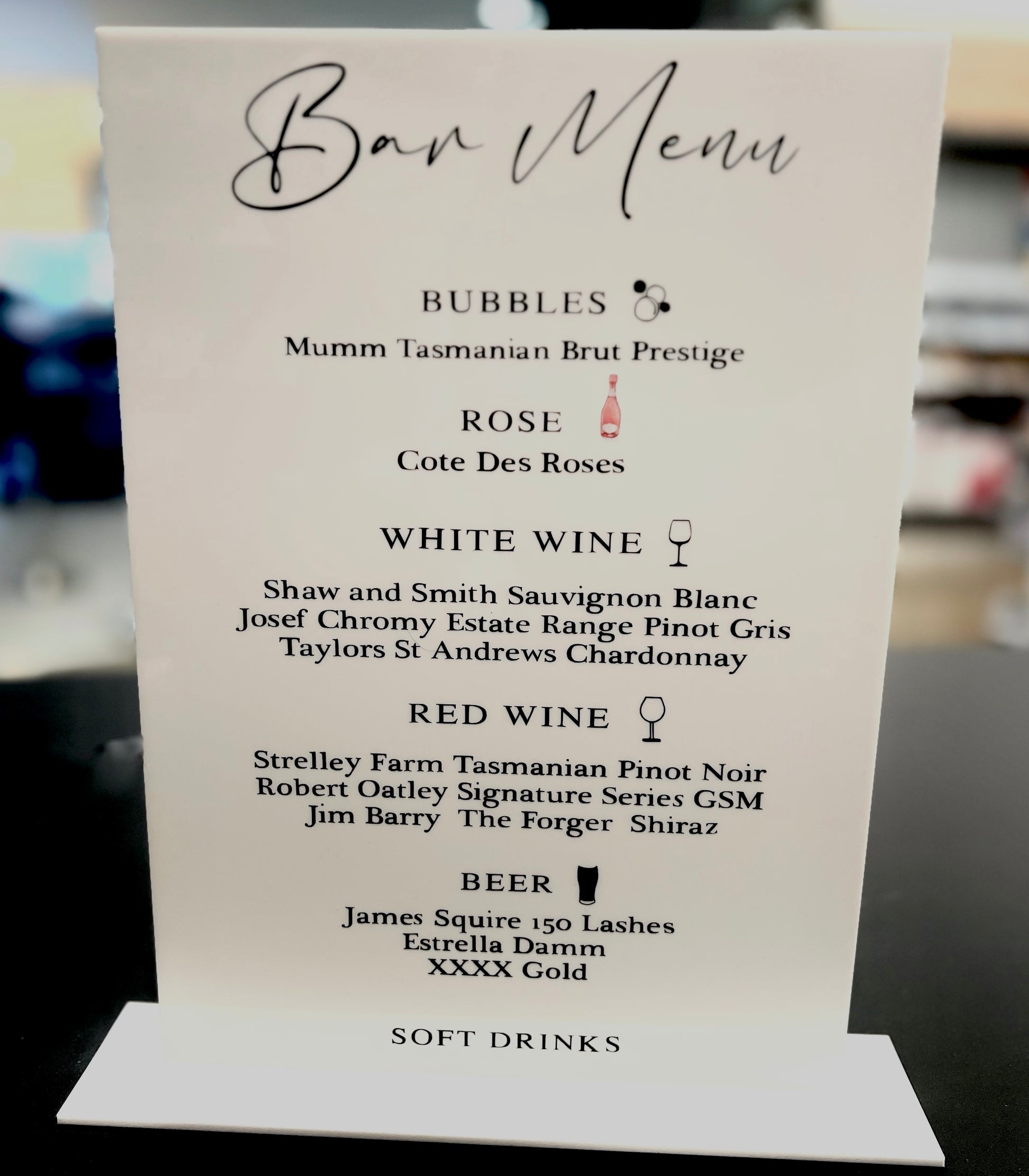 Our Acrylic Bar Menus offer a sleek and elegant solution for weddings, birthdays, and all special occasions. These menus are fully customisable to align with your event theme, available in a range of shapes and sizes to perfectly suit your needs. Crafted to impress, this menu enhances any bar setting while providing a clear, stylish display of your chosen drink selections.